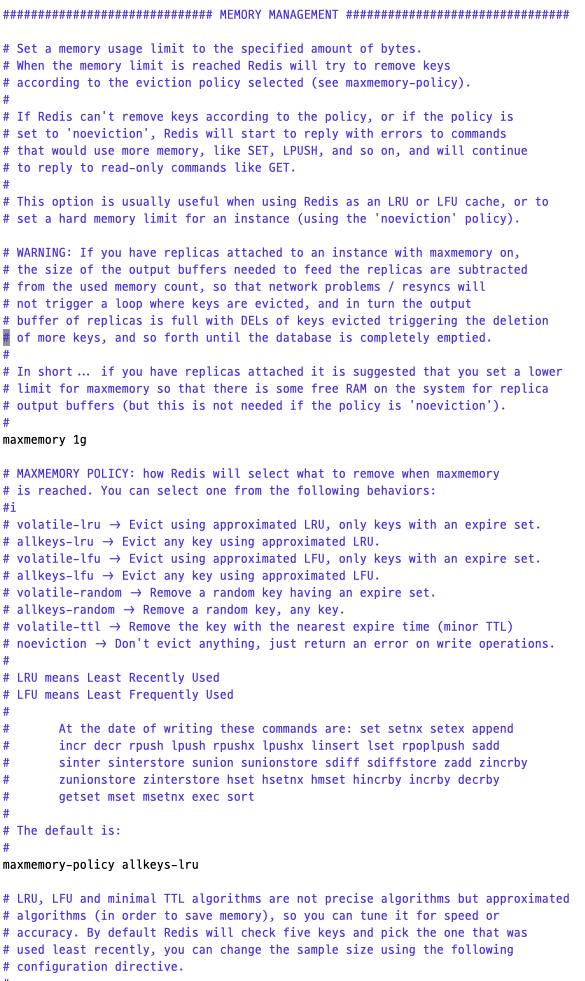 maxmemory-policy 는 모든 키에서 사용된지 가장 오래된 데이터를 삭제하는 방법인 allkeys-lru 알고리즘을 선택했다.